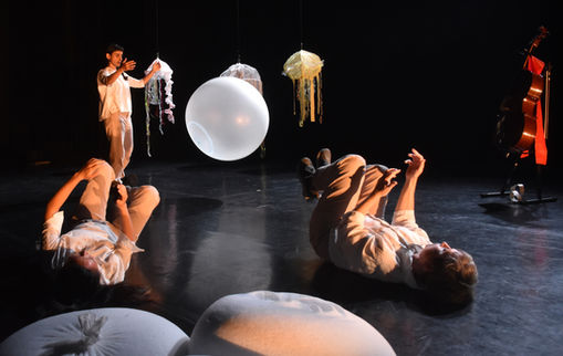 Skywater, Facewater, Underwater Waltz is a live performance combining movement, text, song, sound and objects to explore flow, adaptation and ways of sensing the world, evoking ideas related to deep sea cultures and the environment.